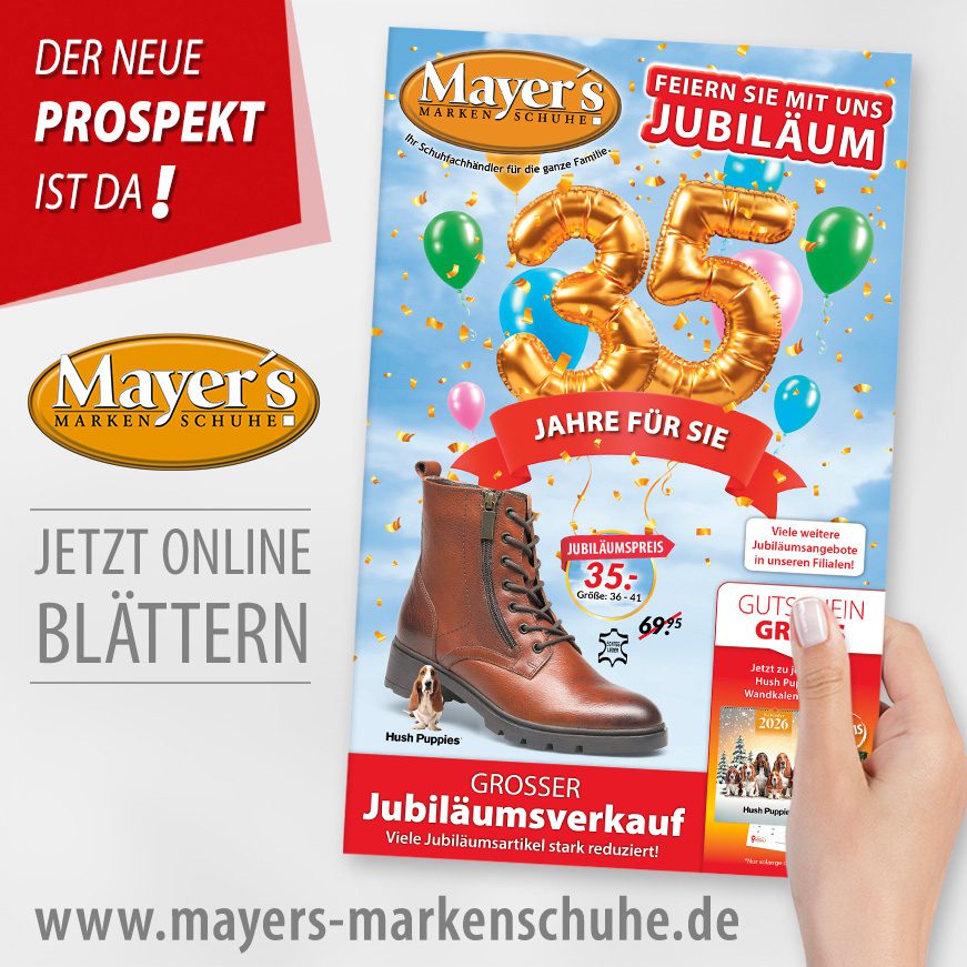 mayer’s markenschuhe gmbhauf 8 seiten bieten wir euch eine bestechende qualität an aktuellen markenschuhen, und andere mode-trends zu absolut herausragenden preisen. viele weitere jubiläumsangebote in unseren filialen! jetzt online blättern: www.mayers-markenschuhe.de03.11.2025 bis 15.11.2025Mayer’s Markenschuhe GmbH