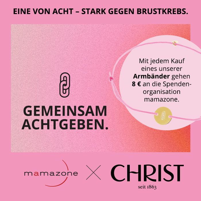 christeine von acht frauen erkrankt an brustkrebs – und doch betrifft es uns alle. als mütter, töchter, freundinnen oder kolleginnen sind wir miteinander verbunden. mit jeder geschichte, jedem armband und jeder geste zeigen wir: wir geben acht – aufeinander, auf uns selbst, auf jede frau. 8 euro pro armband gehen an eine stiftung, die mut macht […]01.10.2025 bis 31.10.2025Christ
