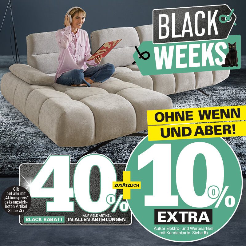 höffnerzu den black weeks erhalten sie bei höffner vierzig prozent rabatt auf alle aktionspreisartikel und zusÄtzlich z e h n prozent e x t r a – auf a l l e s! außer elektro- und werbeartikel. mit kundenkarte. mehr unter hoeffner.de a) im möbelhaus gewährt ihnen höffner auf alle als „aktionspreis“ gekennzeichneten artikel 40% […]19.11.2025 bis 02.12.2025Höffner